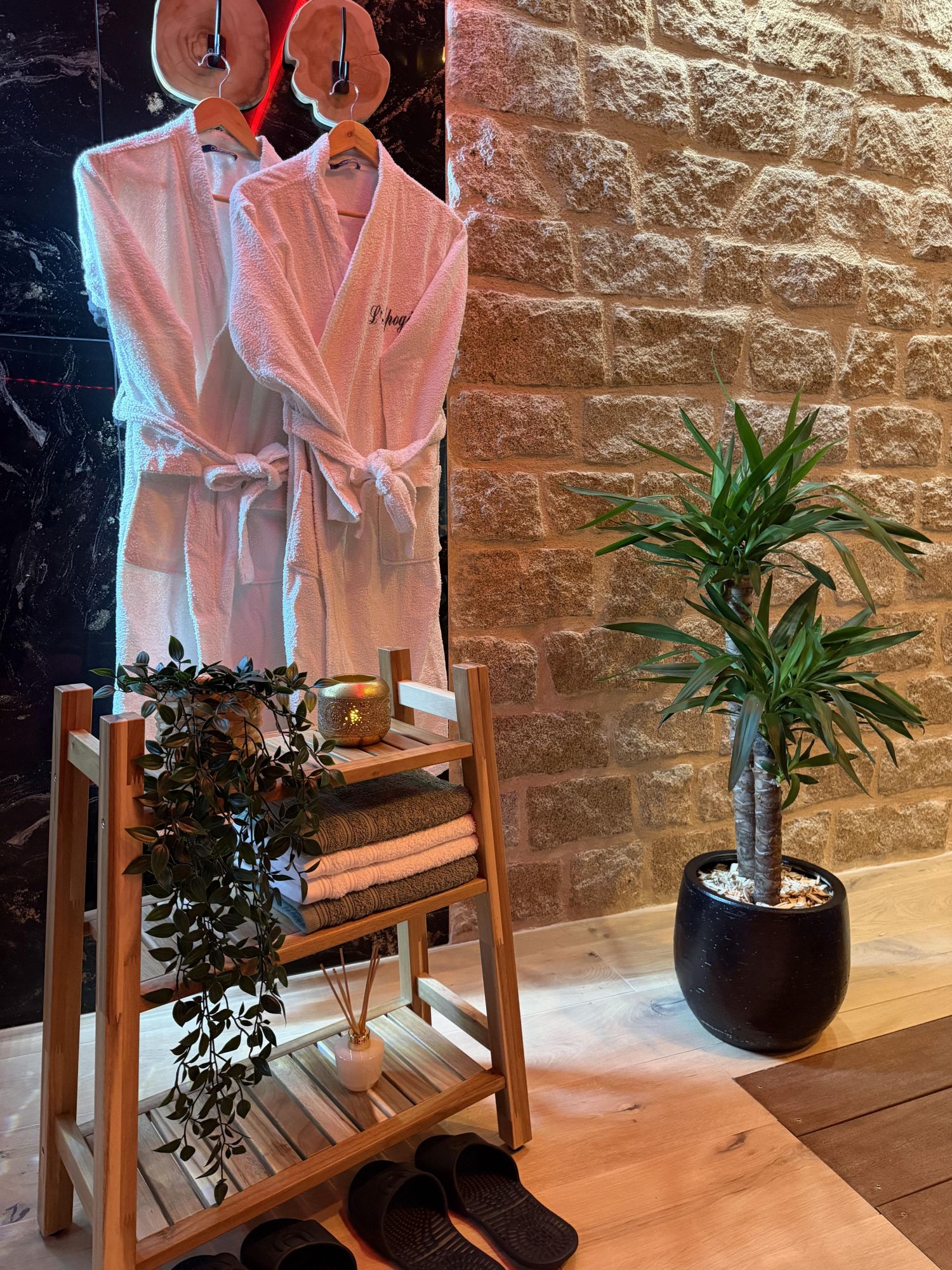 - Des serviettes, peignoirs et sandales de spa.